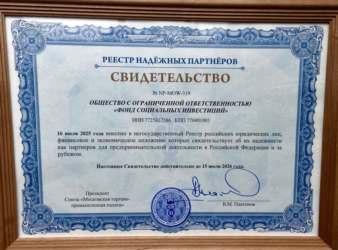 Фонд социальных инвестиций включён в Реестр надёжных партнёров, который ведётся Торгово-промышленной палатой Российской Федерации и территориальными ТПП.